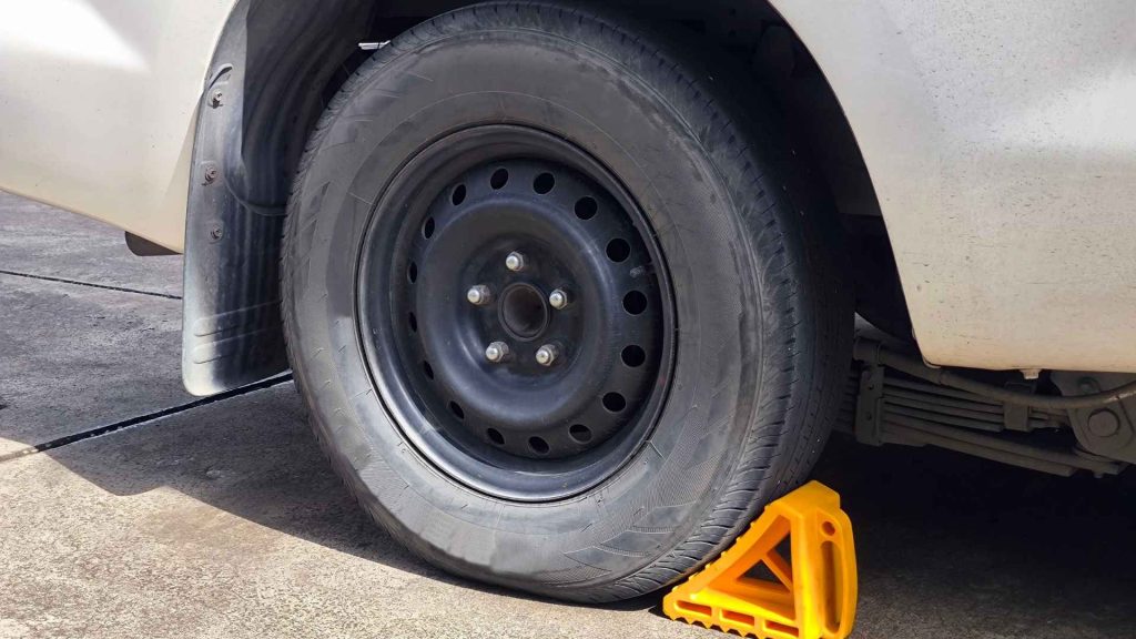 Langkah selanjutnya dari menggunakan dongkrak adalah, memastikan bahwa mobil telah mengaktifkan rem tangan. Selain mencegah mobil bergerak, hal ini memastikan keselamatan pengguna dongkrak menjadi lebih aman.